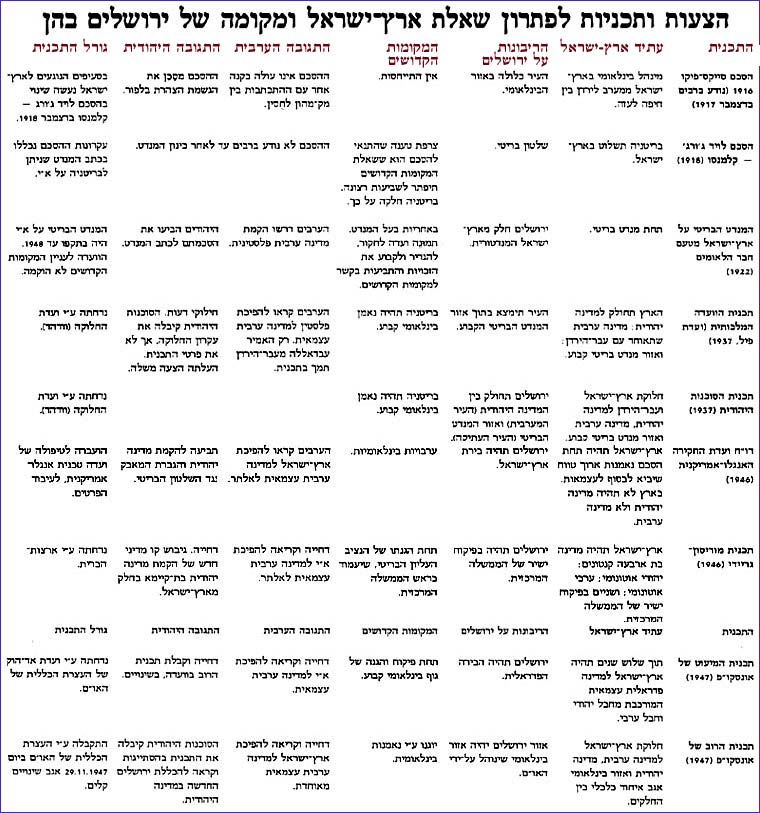 המעוניינים לדעת את הרקע לעמדות ההנהגה הציונית באותה תקופה, ימצאו עניין במאמרו של יאיר פז: "התוכנית לחלוקת ירושלים החדשה,1938-1937" העוסקת בעקרונות ועדת פיל בעניין ירושלים והמקומות הקדושים. עיינו גם בטבלה הבאה, המציגה "תוכניות והצעות לפתרון סוגיית הריבונות על ירושלים עד 1947", ונסו למצוא: