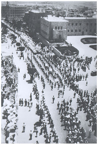 התהלוכה הענקית המשיכה את דרכה. דגלי תכלת לבן נישאו לפניה בגאון וטרנספרנטים עם כתובות "ווייצמן הבוגד, רד!", "חרות או מות", "תחי מלחמת השחרור" וכתובות דומות לאלה התנשאו מעל לראשי המפגינים נשמעו קריאות נגד אנגליה הבוגדת וקריאות "תחי המדינה העברית משתי גדות הירדן".